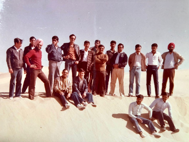 1 Sqn Jaisalmer, end January 1984. Sitting: Vashisht, Saha, Nijjar, Saini, Tam Sarma, Zapo Sinha, Jimmy Thomas, Koti Rao. Standing: Sahota, Kika Khanna, OR Parsad (partially hidden), Fuzz Moulik, Santa, Oka, Teshter, SC Mehta, Harish, Kadian, Mallu Malhotra. Newly married Sandip Sud went back to Gorakhpur ferrying an aircraft.