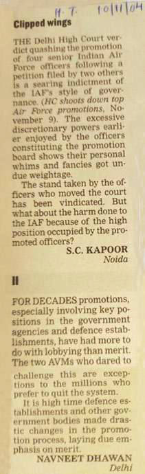 Despite his impeccable, difficult to match Service record, as we saw above, it is rather discouraging for any dedicated Military person like Masand Sir to move court for promotion to the higher rank. And unfortunately it happened with Masand Sir. Despite being number 1 in the merit, he was denied promotion to the rank of Air Marshal. The questionable discretionary power usurped by the Promotion Board drew flak from within the Military Service and civilians. Some “Letters to the Editor” published in the leading newspapers and magazines attached here testify to the fact that public opinion was overwhelmingly in favour of Air Marshal Masand who bore the brunt of faulty promotion policy. The landmark judgement by the Supreme Court to reinstate him in IAF with promotion and salary arrears forbids any future Promotion Board to usurp discretionary powers beyond prescribed limit. It is noteworthy that even the Russians recognised his talents and abilities and invited him to fly their brand new MiG-35 in Aero India 2009 in Bangalore. I understand that many of the upgrades in the MiG-35 were based on the inputs given by then Wing Commander Masand to the Chief Designer of Mikoyan, Mr RA Belyakov, during his visit to Poona in 1988-89. Unfortunately, however, IAF’s senior leadership chose to overlook his impeccable service record.